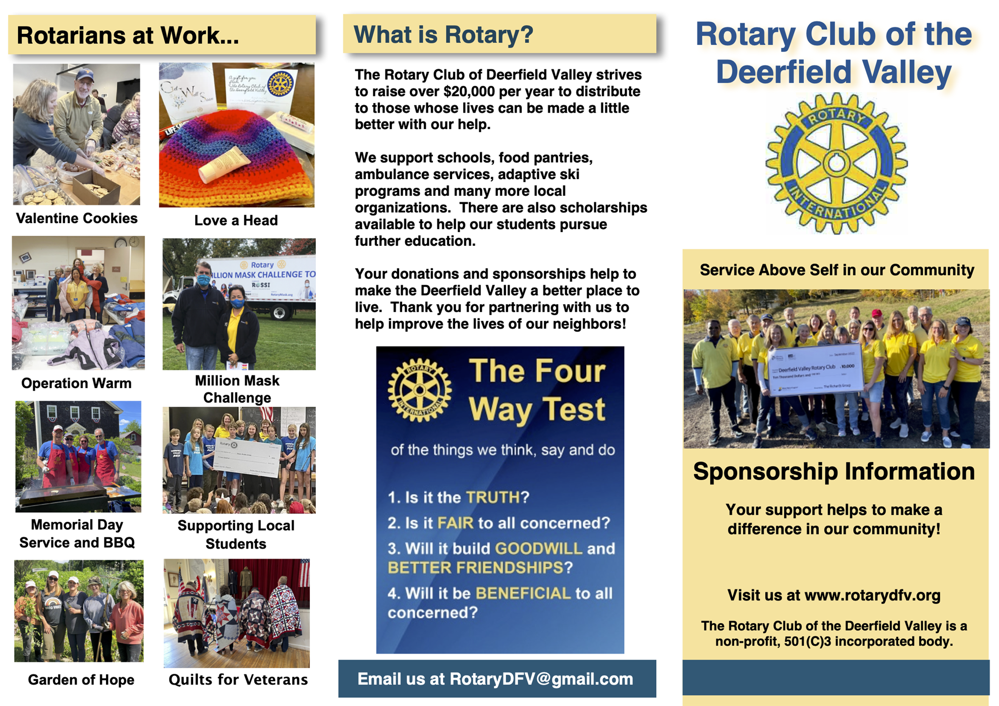 The Rotary Club of Deerfield Valley strives to raise funds to distribute to those whose lives can be made a little better with our help.